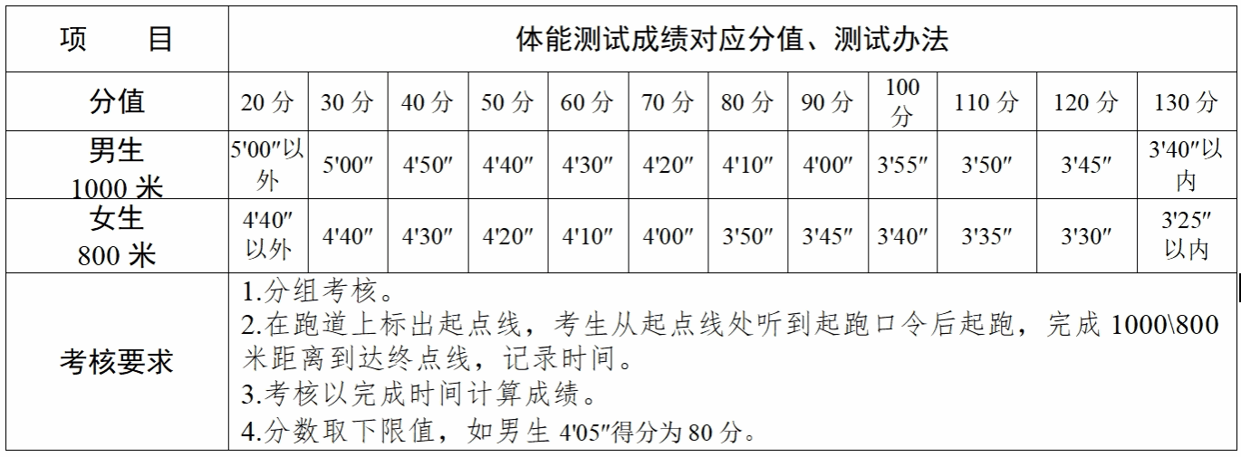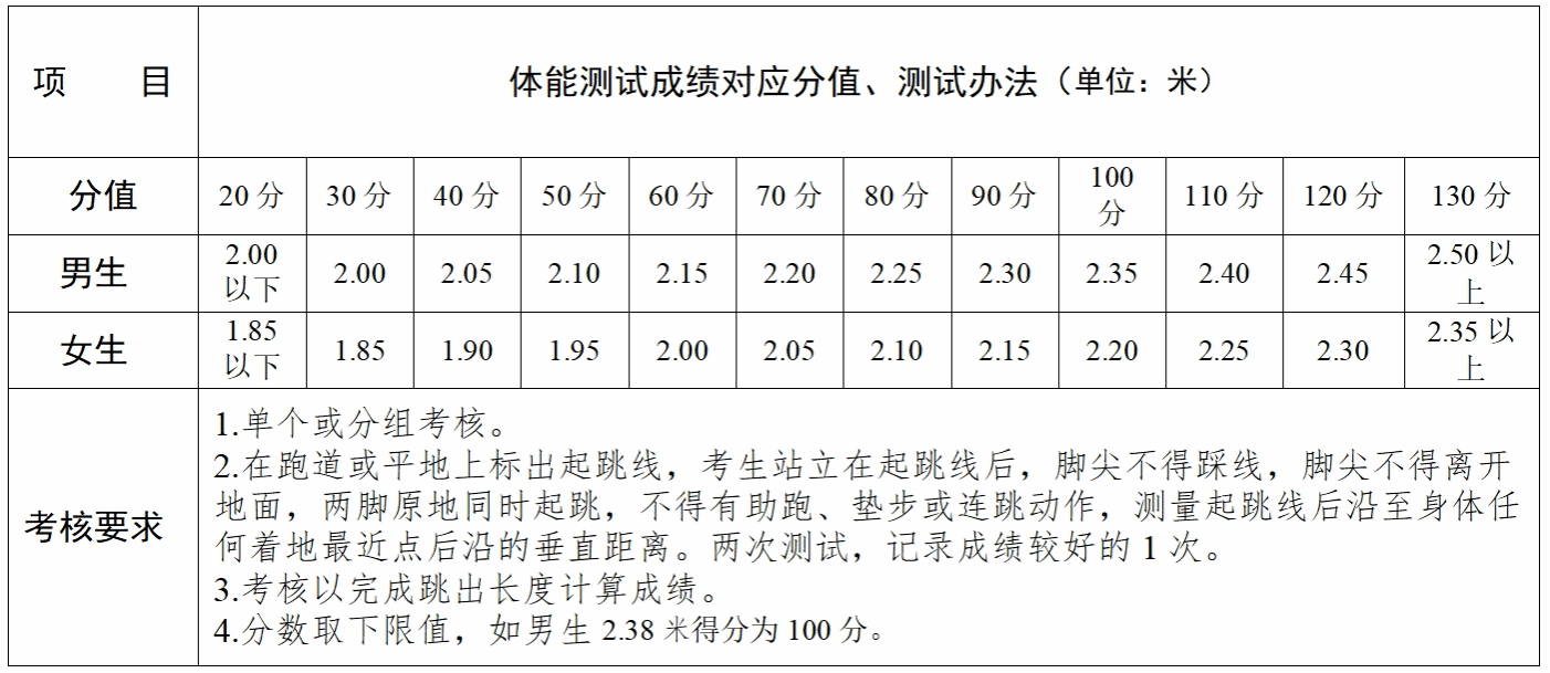 备注:1000(800米)跑步测试标准和立定跳远测试标准主要参考《国家综合性消防救援队伍消防员招录体能测试标准》和《国家学生体质健康标准(2014年修订)》
